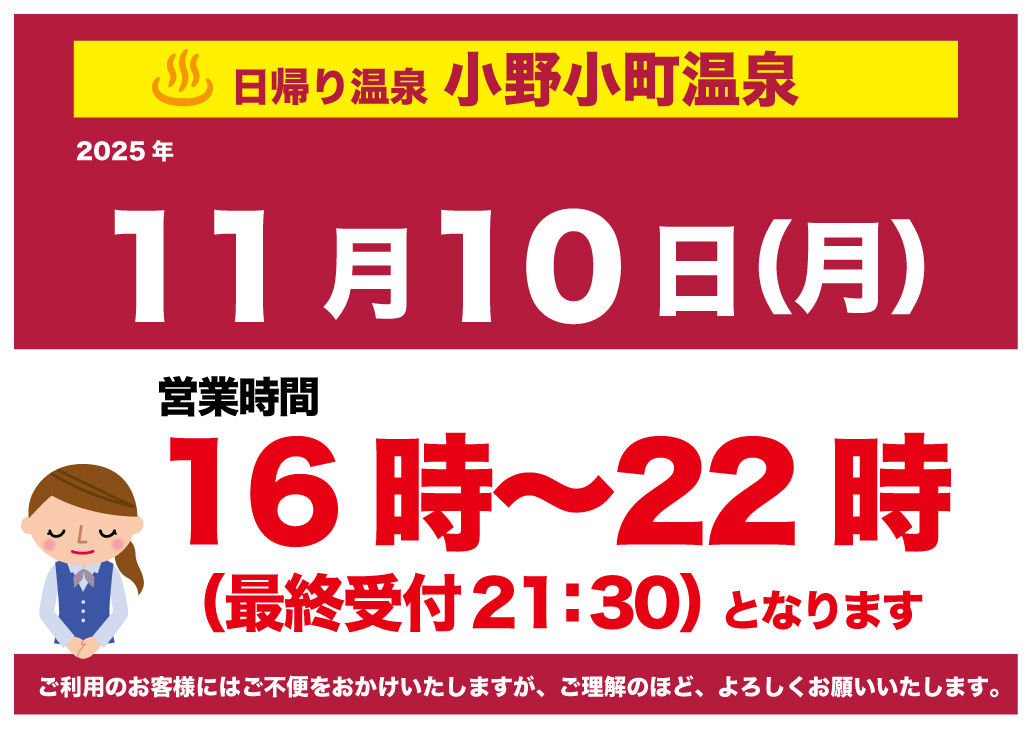 2025年11月10日(月)の日帰り入浴の営業時間は16時~22時(最終受付21時30分)となります。 ご利用を予定されているお客様へは大変ご不便をおかけいたしますが、ご理解の程、よろしくお願いいたします。