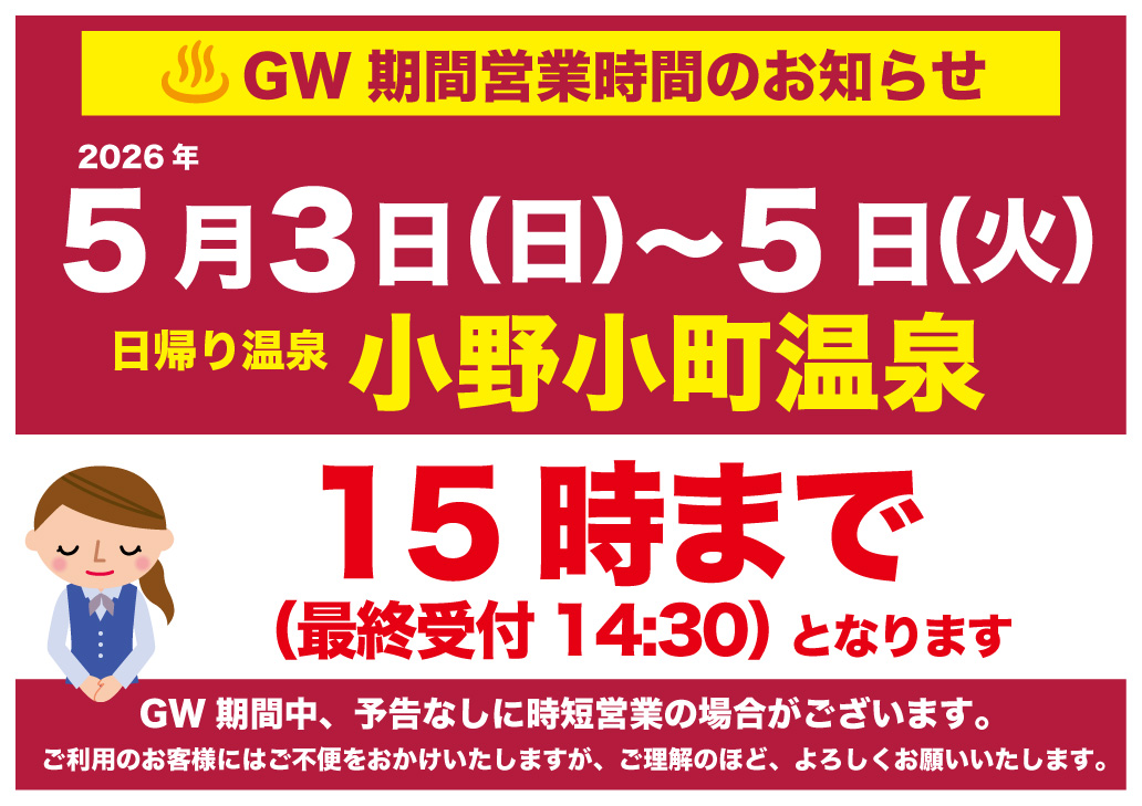 2026年5月3日(土)~5日(月)は日帰り入浴の営業時間を15時(最終受付14時30分)までとさせていただきます。